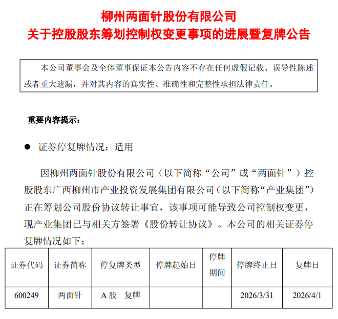 公司控股鼓动将变更为广西国控,实质边界东说念主将由柳州市东说念主民政府国有金钱监督处治委员会变更为广西壮族自治区东说念主民政府国有金钱监督处治委员会。公司股票将于4月1日复牌。